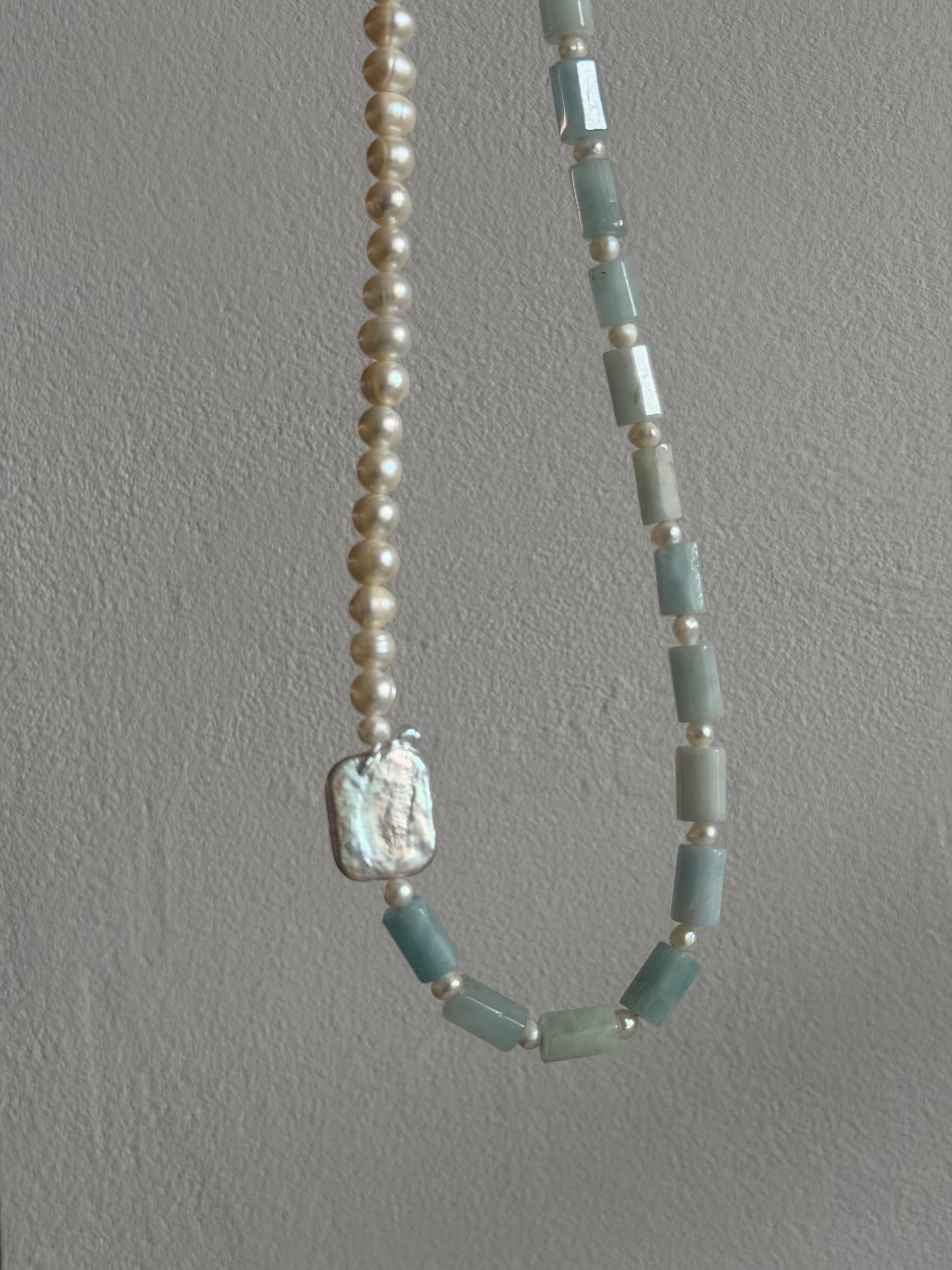 Colier realizat manual din pietre de Acvamarin si Perle naturale de cultura cu charm lateral Perla baroc dreptunghiulara.