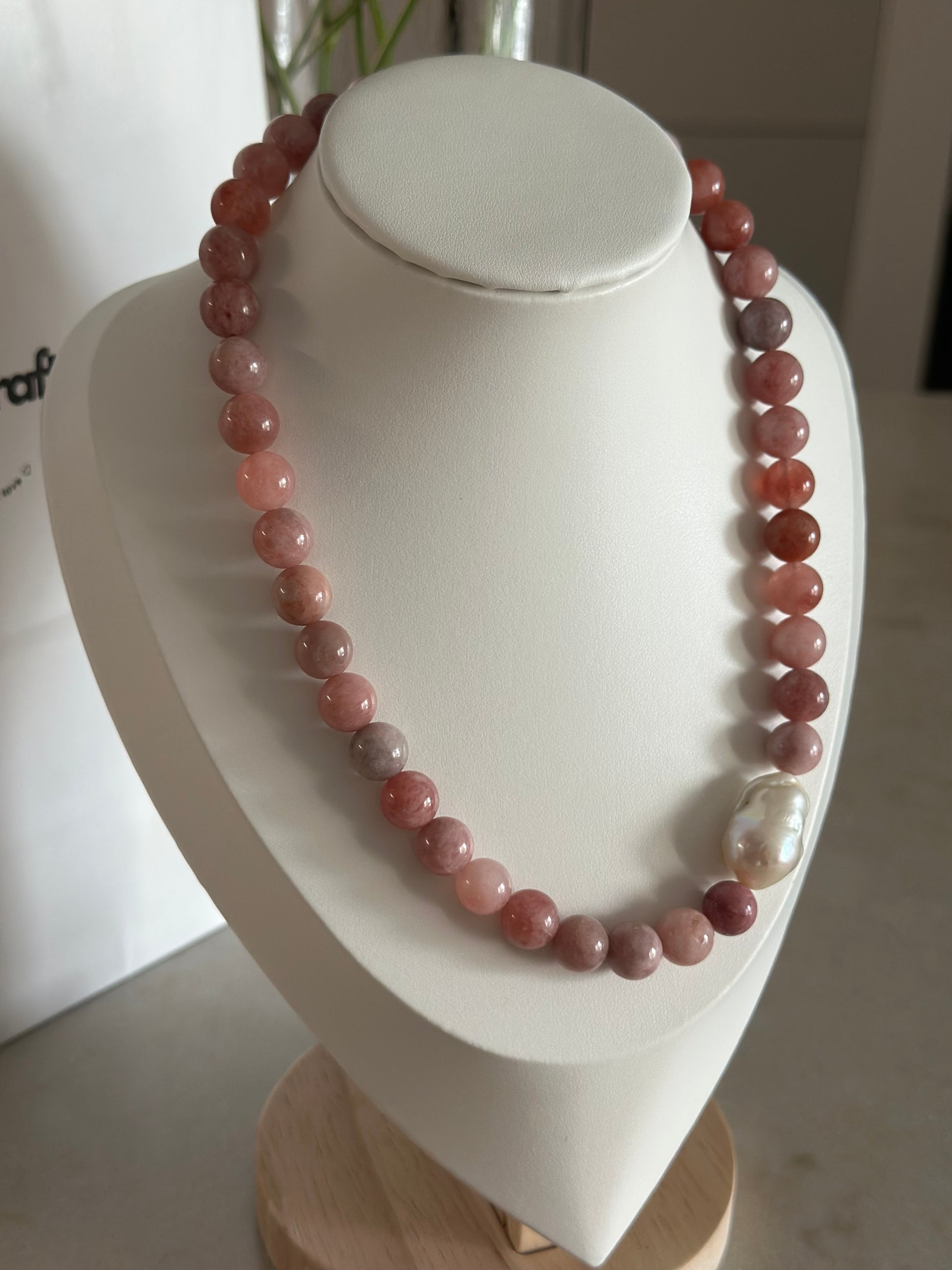 Colier realizat manual din pietre de 10 mm Strawberry Quartz si charm lateral perla de cultura baroc.