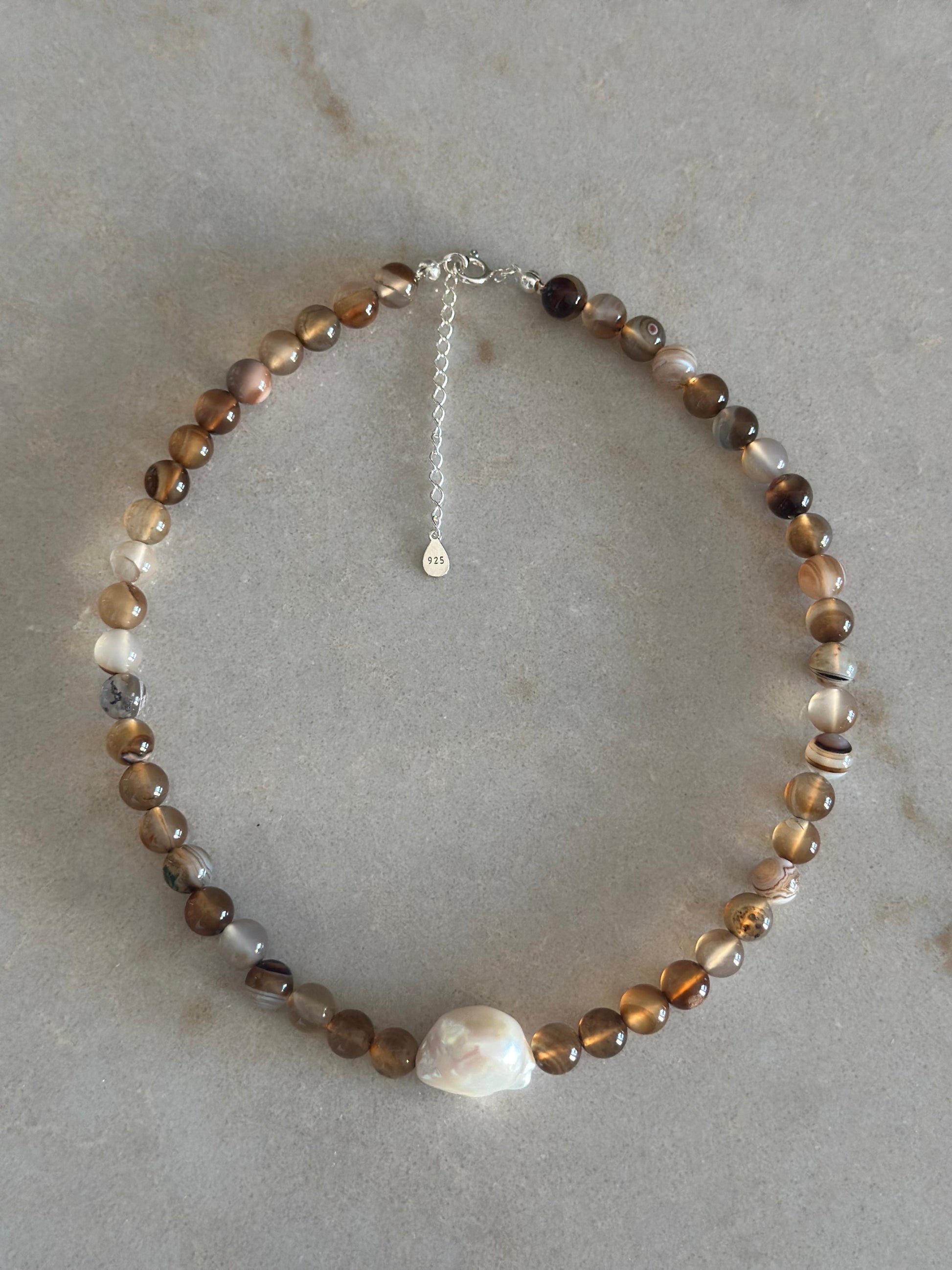 Colier realizat manual din pietre de Agat maro 8 mm si charm perla de cultura baroc.