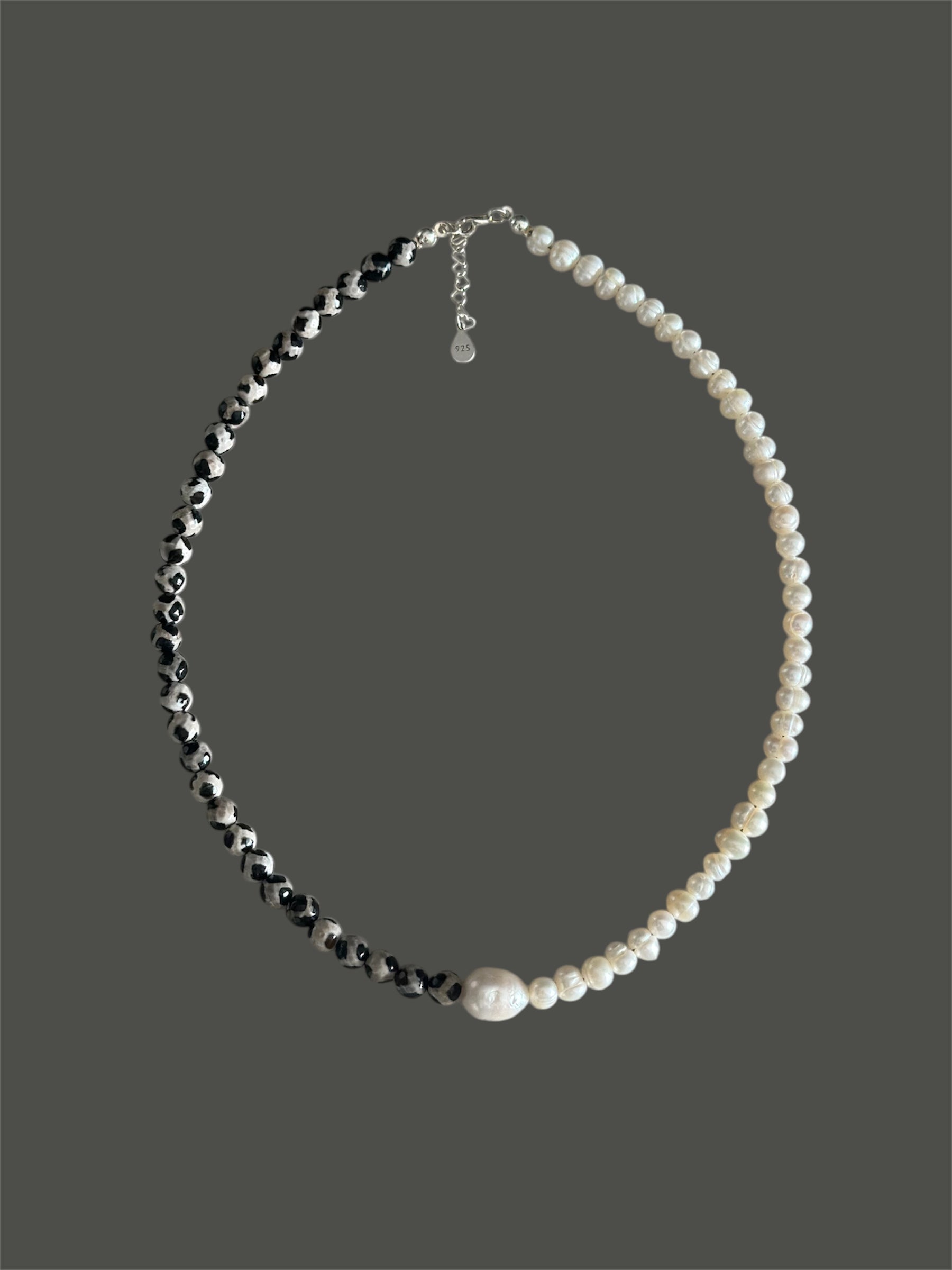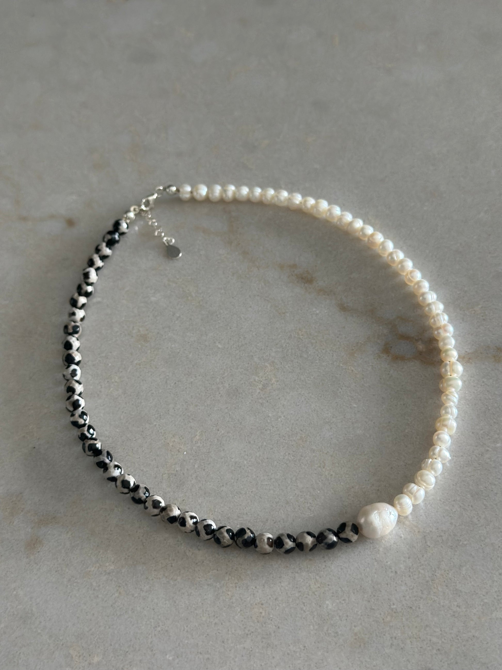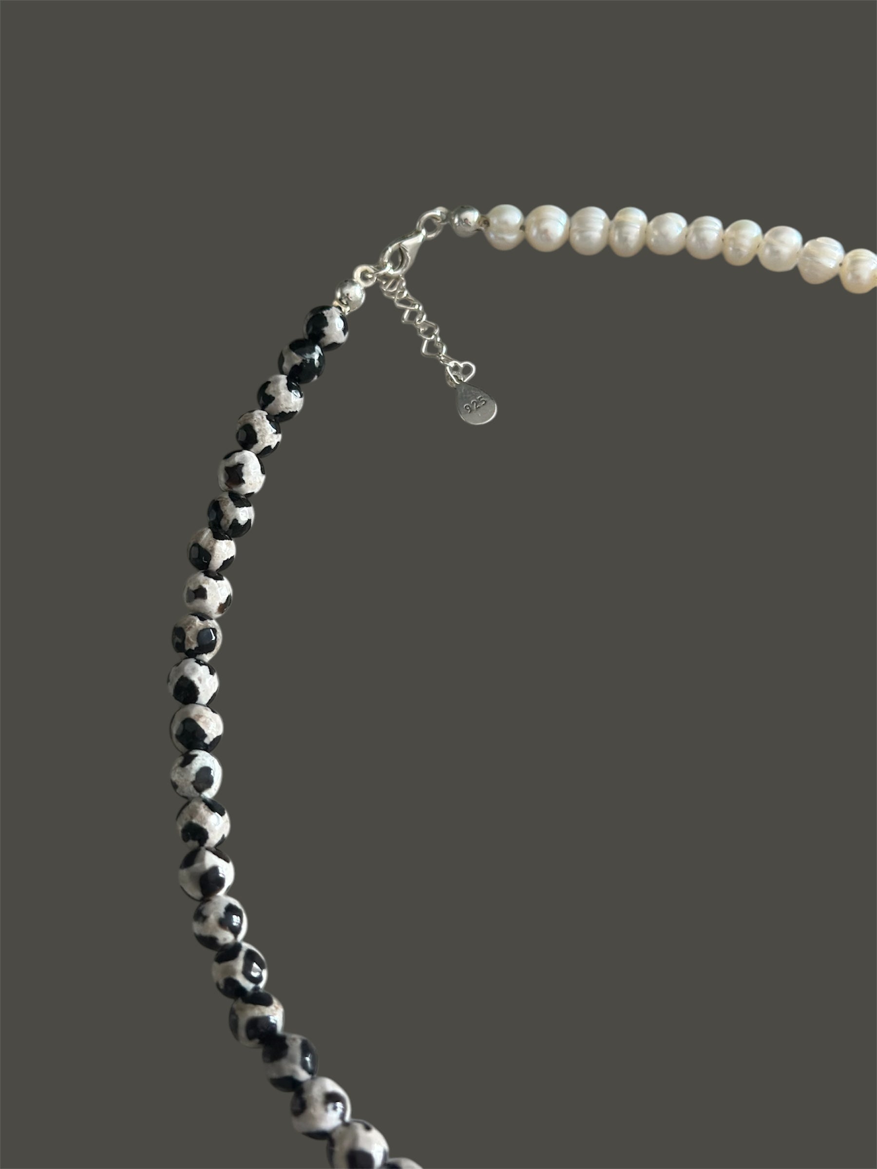 Colier realizat din Jasp Dalmatian 6 mm si Perle de cultura de dimensiune 5-6 mm.