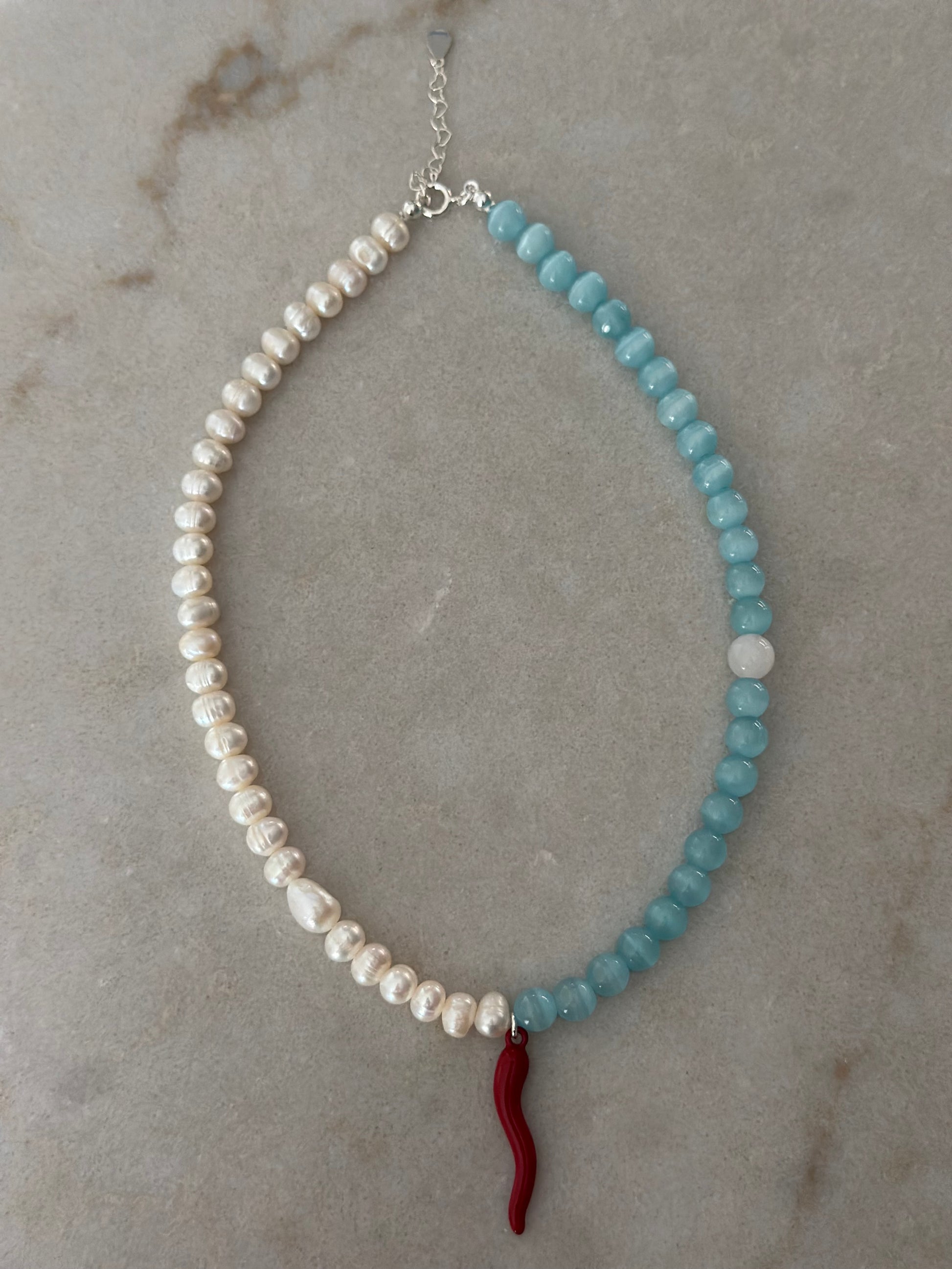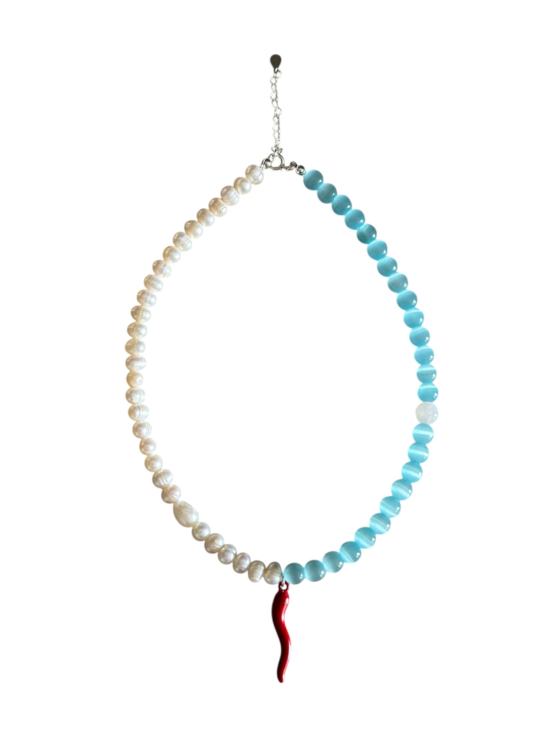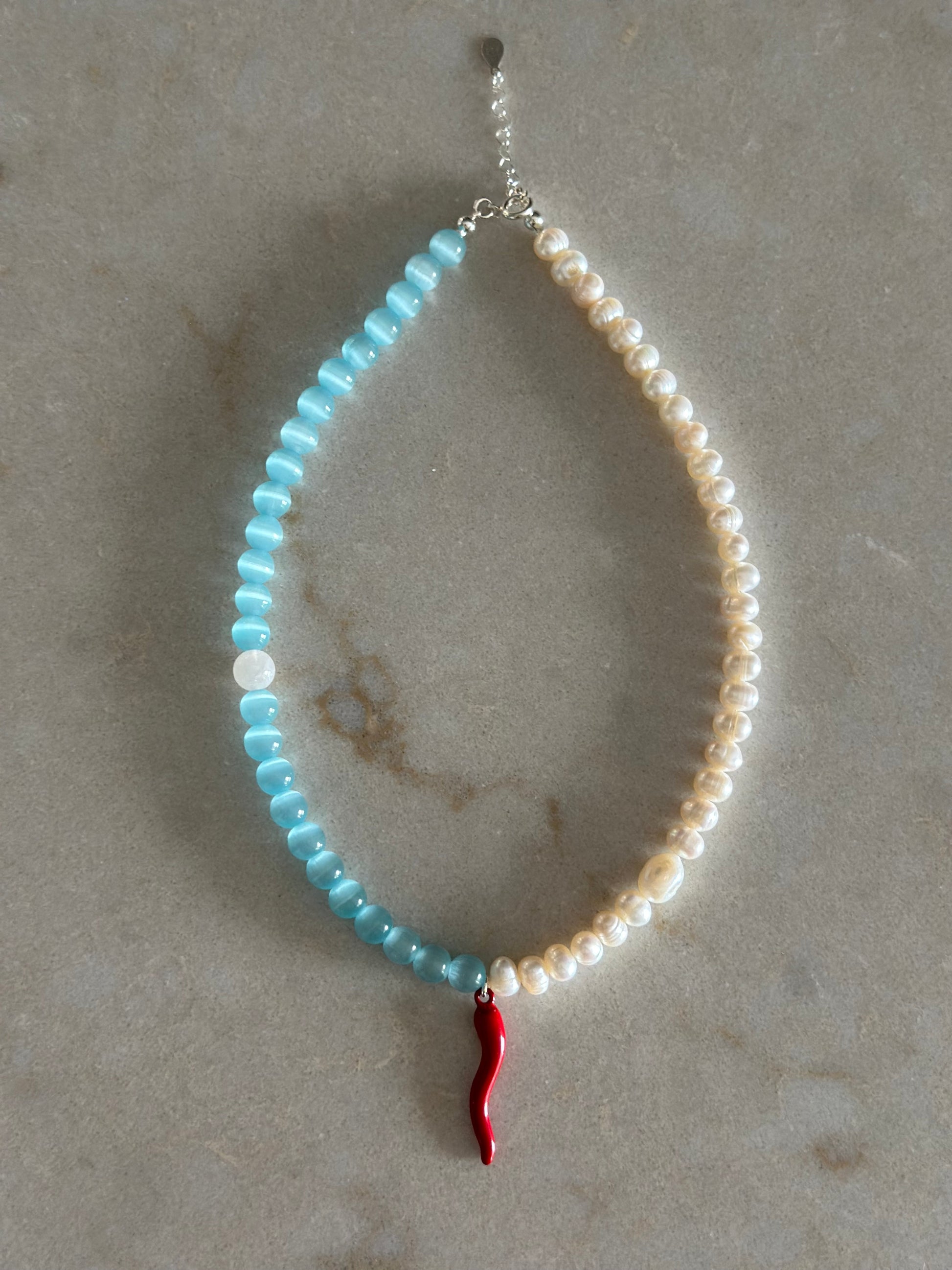 Blue Cat Eye Chilli Charm Pearl Necklace