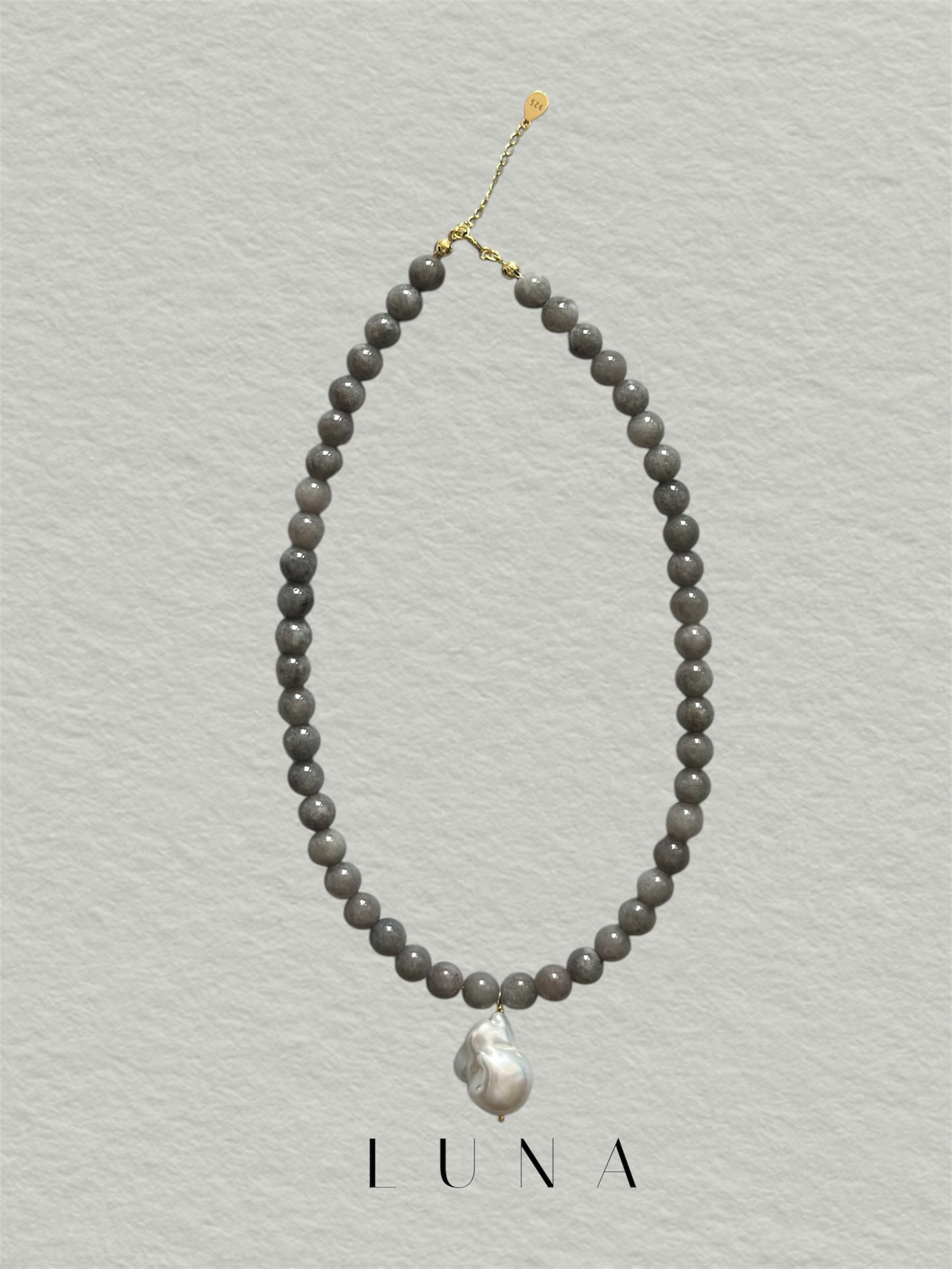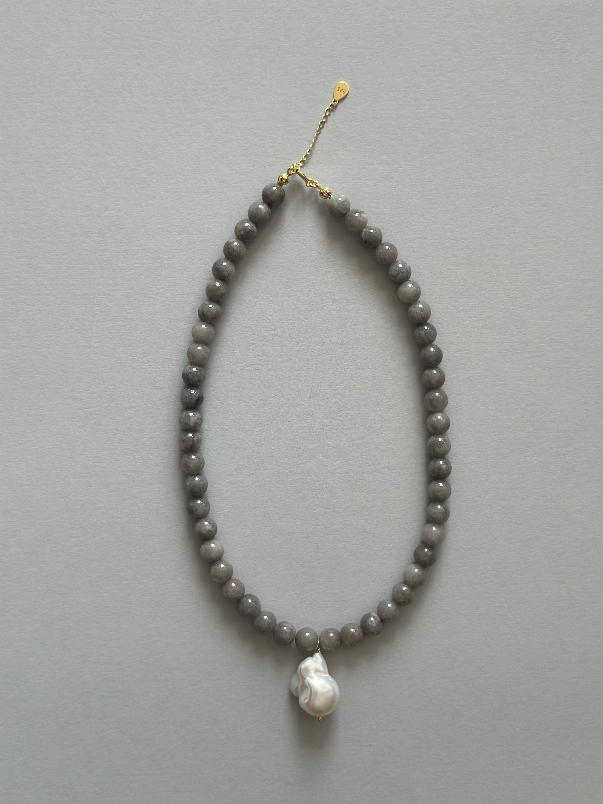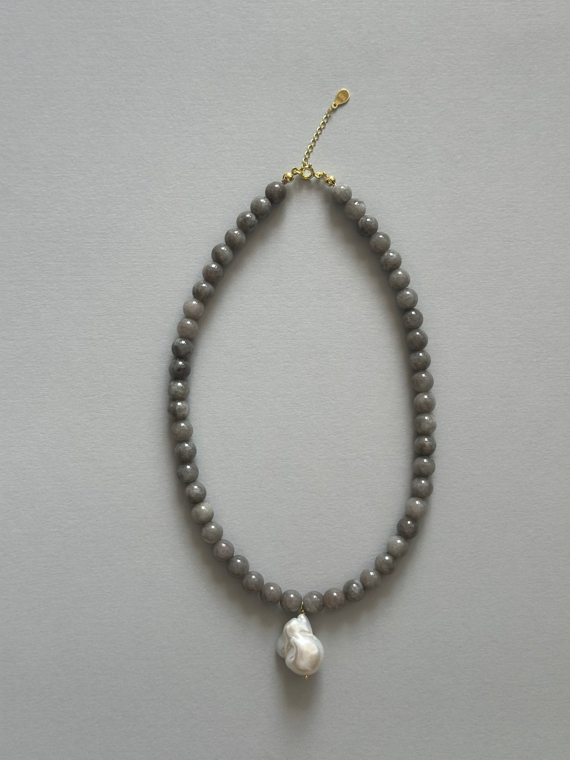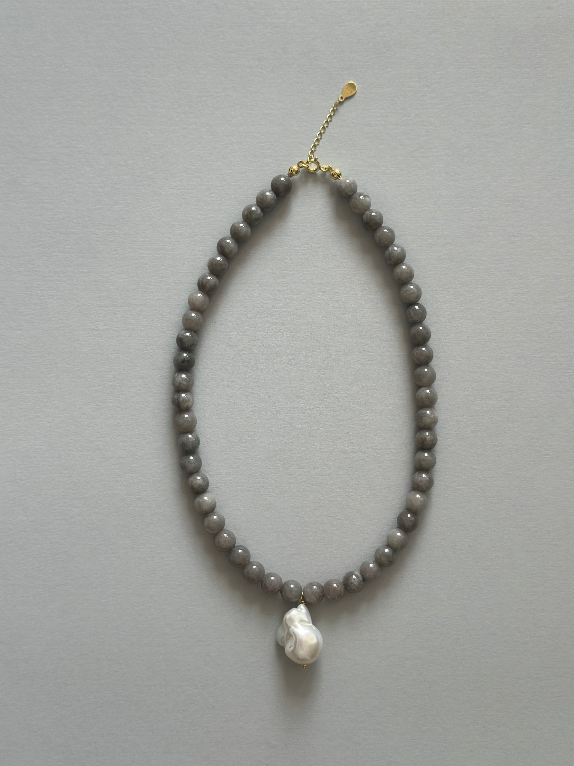 Colier realizat manual din pietre de Jad birmanez 8 mm si charm perla de cultura baroc.