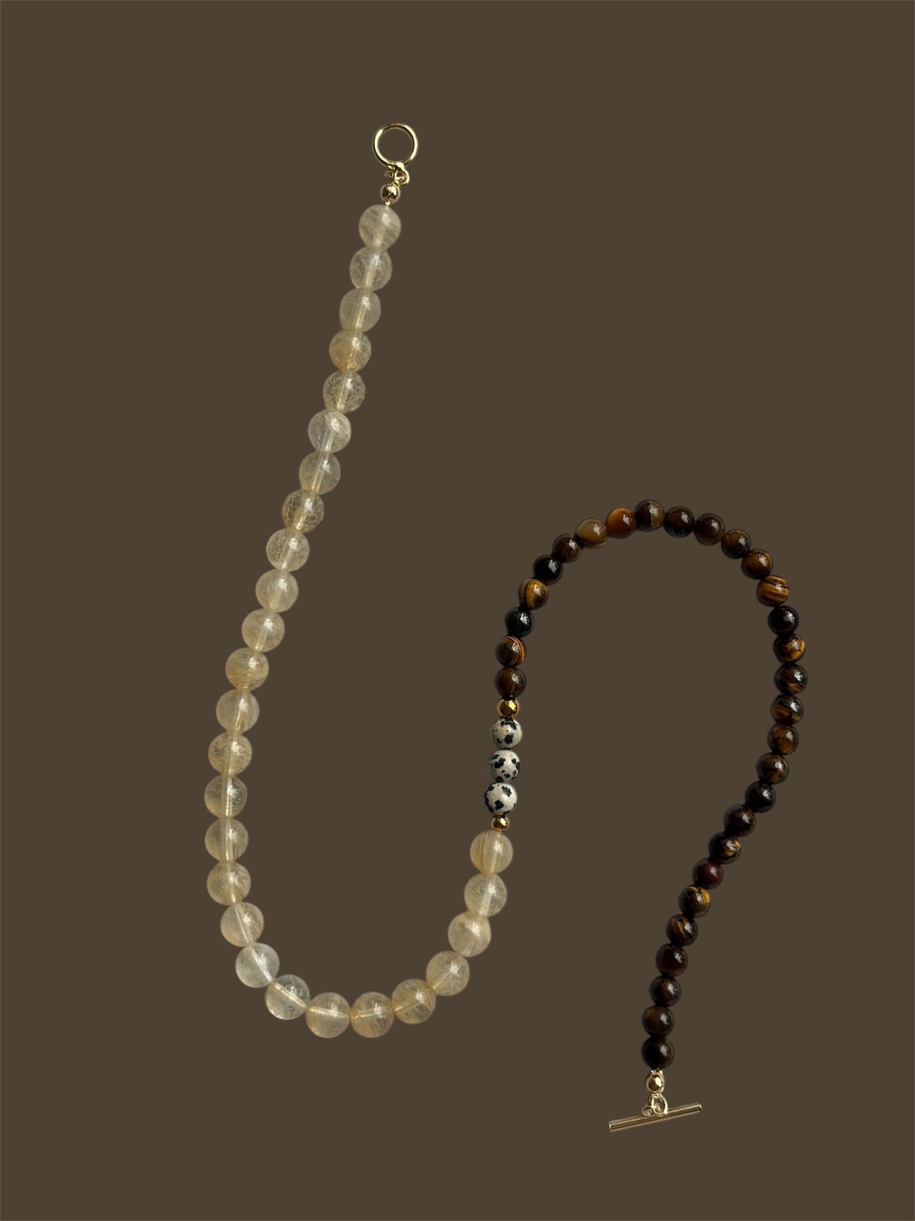 Colier in culori de toamna realizat din Citrin, Ochi de tigru si Jasp dalmatian.