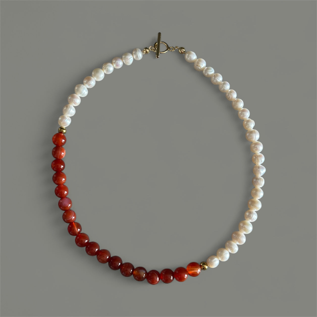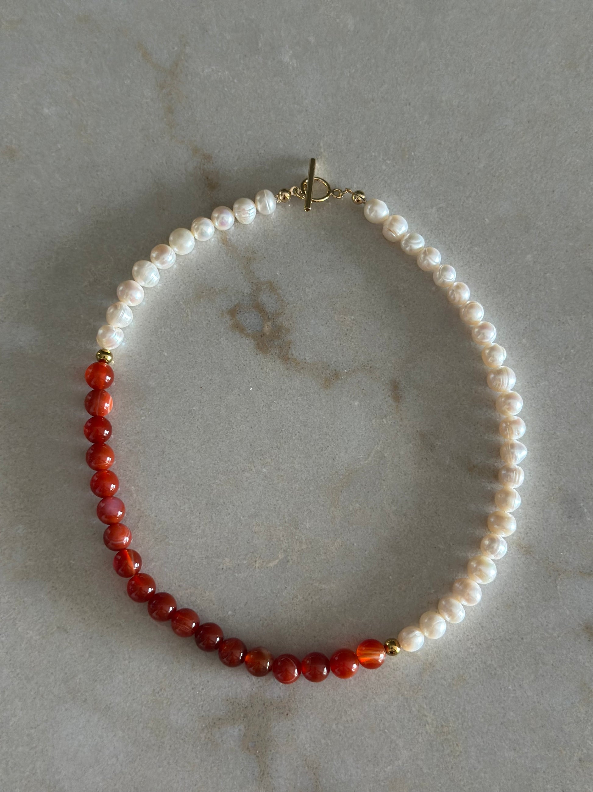 Colier realizat din Perle de cultura 6-7 mm si pietre de Agat rosu.