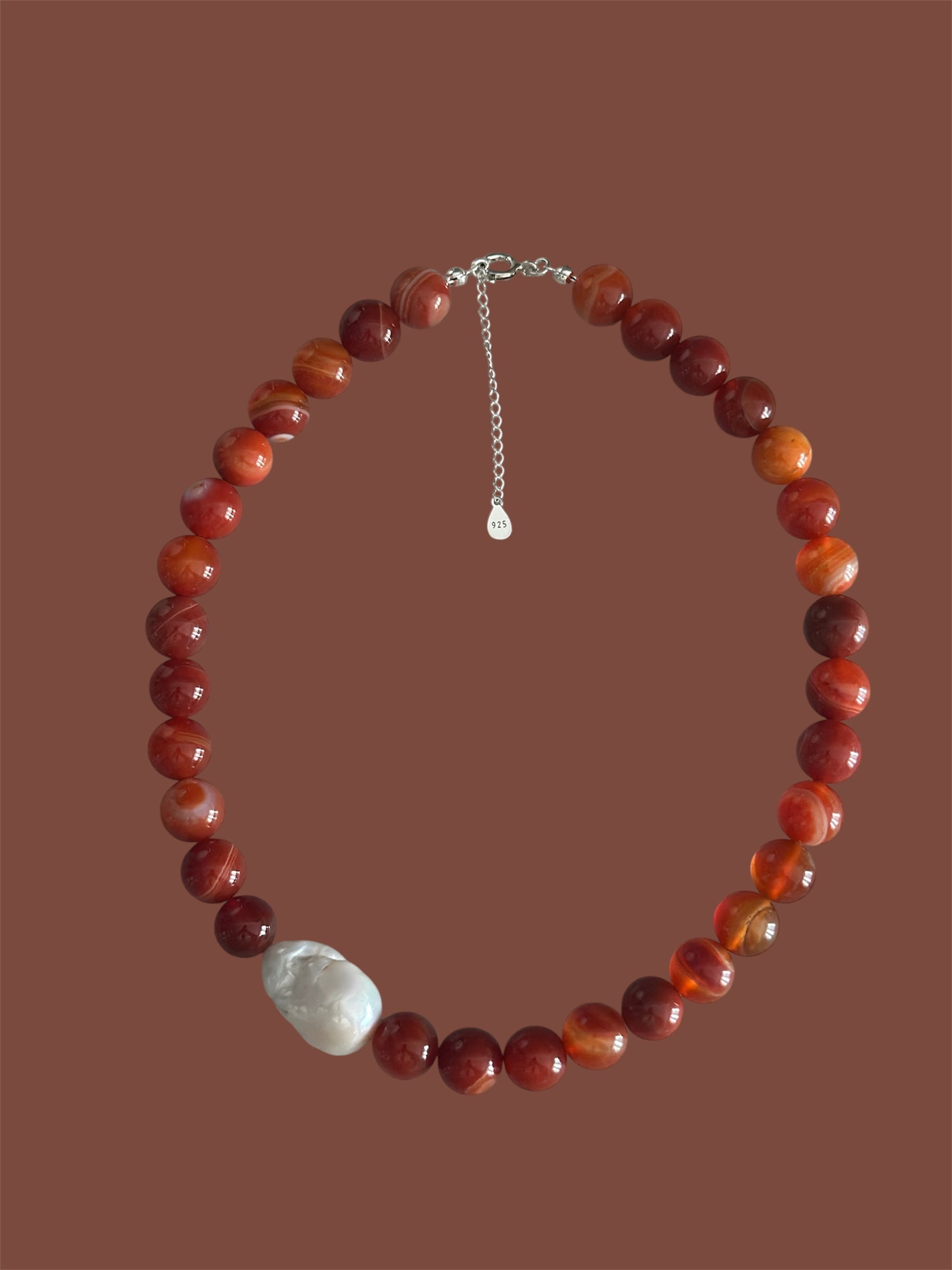 Colier realizat din pietre de Agat rosu 12 mm si charm lateral perla de cultura baroc.
