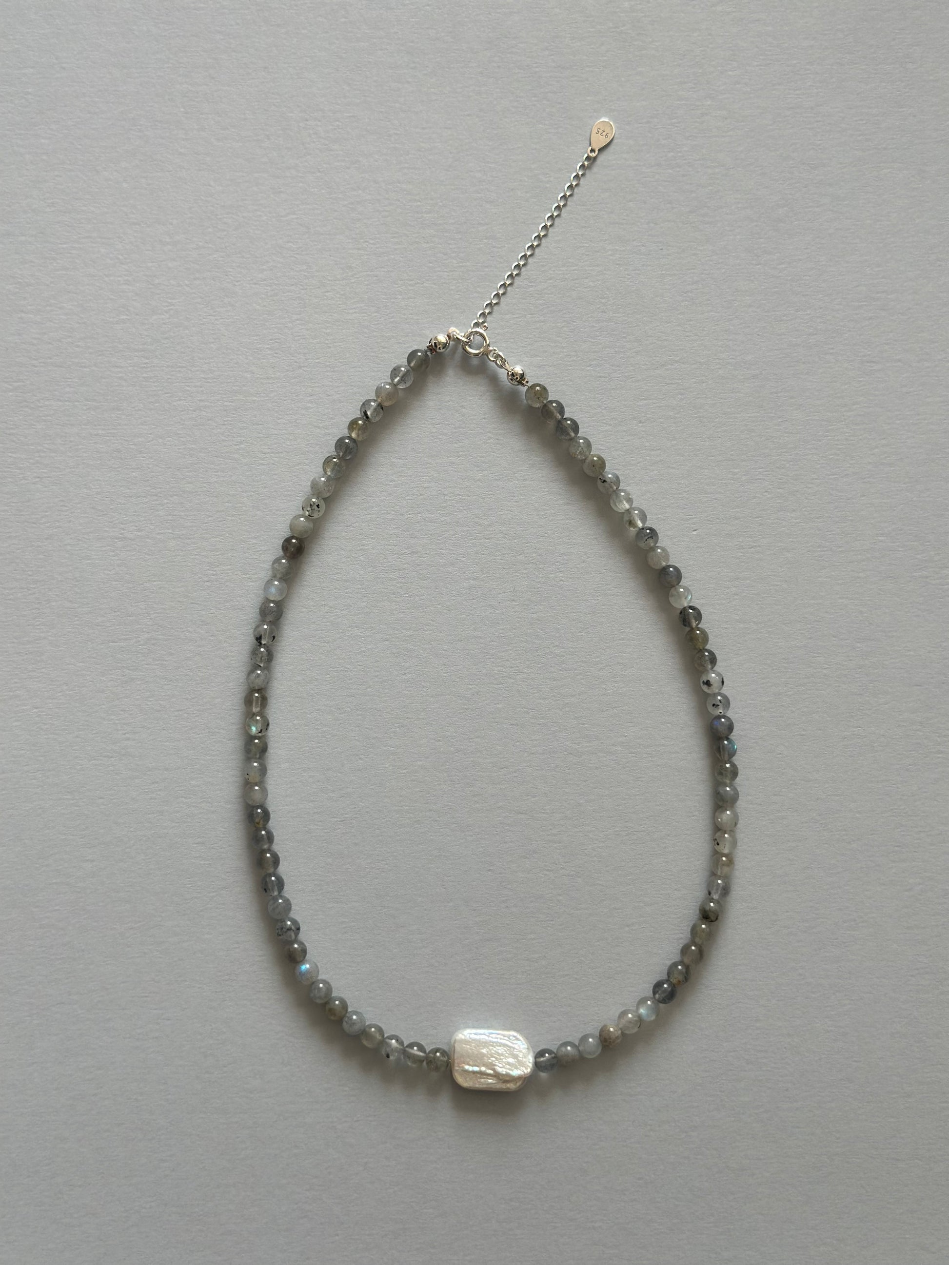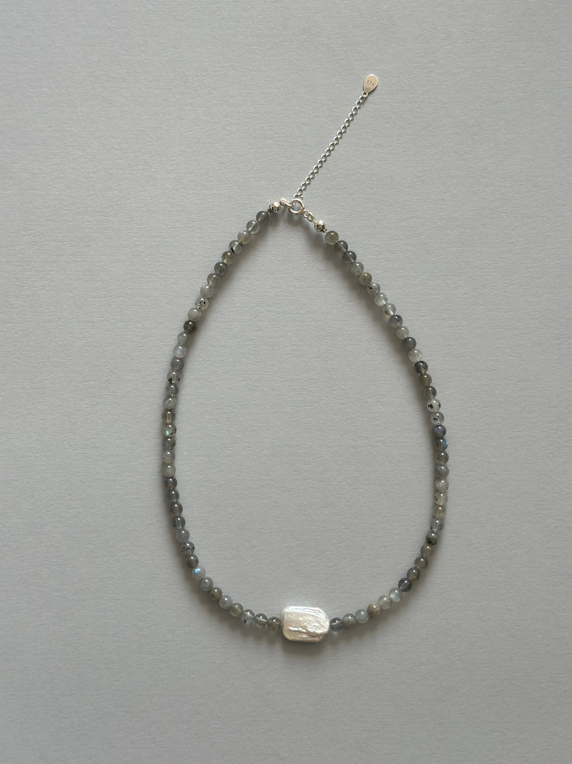 Colier la baza gatului realizat manual din pietre de Labradorit si charm perla naturala de cultura baroc.