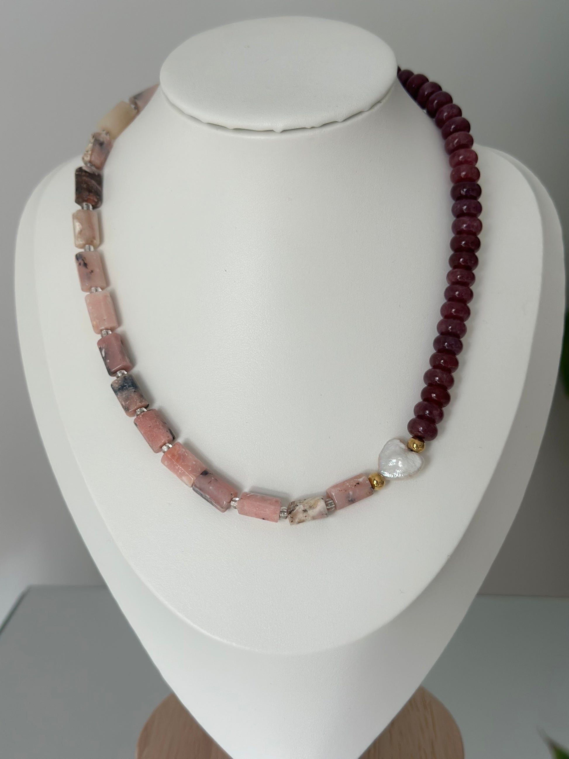 Colier handmade realizat din Jad Violet si Opal Roz cu charm Perla de cultura in forma de inima.