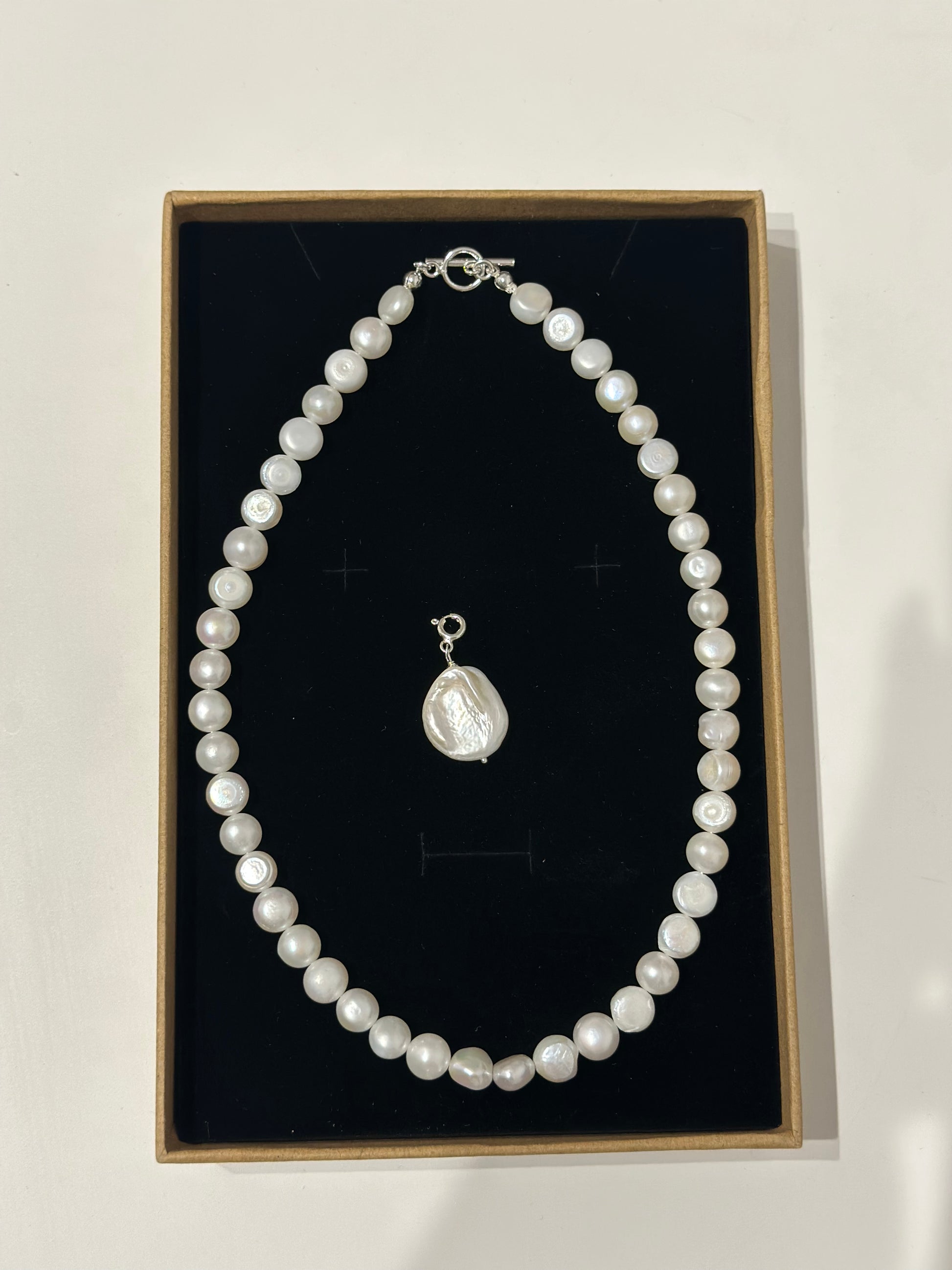Colier realizat manual din Perle de cultura plate de dimensiune mare cu medalion detasabil.